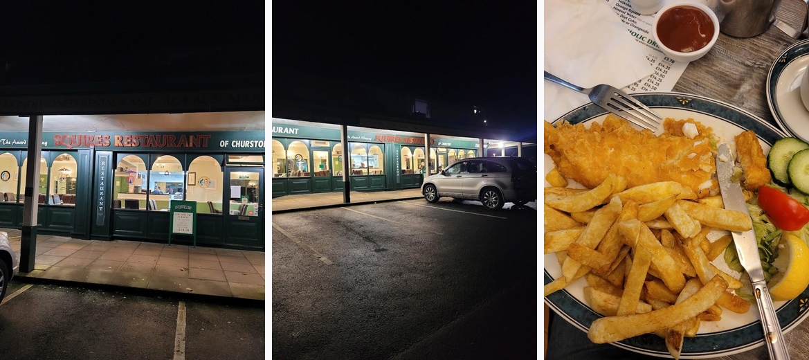 After a busy day out we decided to get Fish and chips for tea. We didn't really know where to go. We are so happy we found Squires. It has a lovely large seating area but we wanted to go back to our Holiday Park so we got takeaway. It was absolutely delicious. The fish was cooked fresh, no soggy batter or greasy chips. Just delicious. Excellent service too. Would definitely go back there.