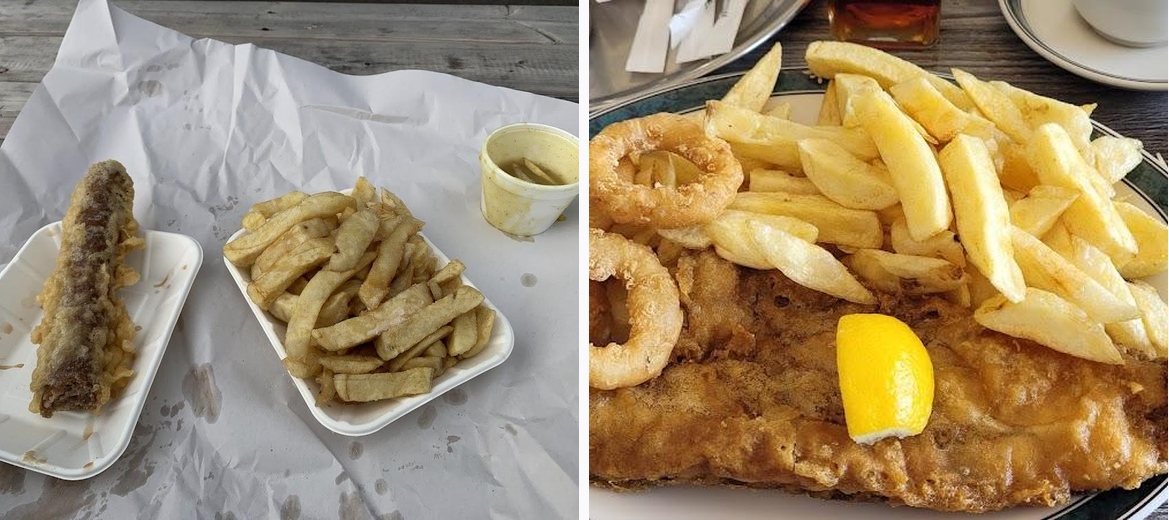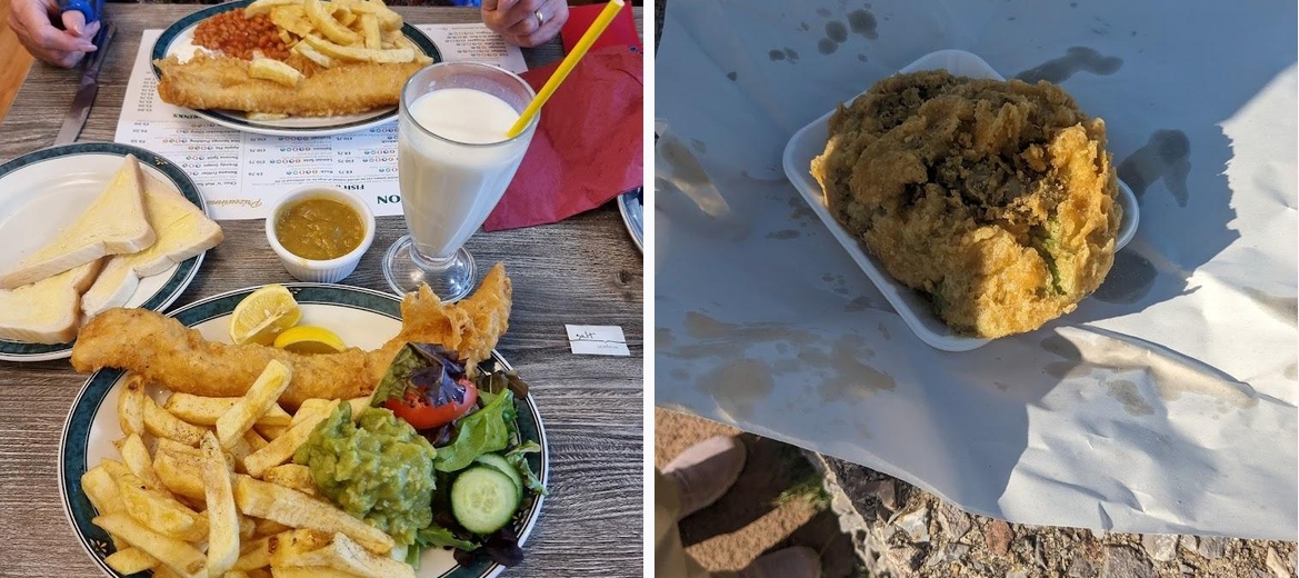 You can't go wrong with their classic fish and chips, particularly the large cod. Also, try the prawn cocktail for a flavorful starter, and don't miss the banana fritter for dessert.